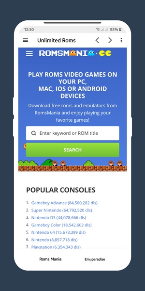 Unlimited ROMs – незаменимое приложение для геймеров, кто любит эмулировать классические игры на компьютерах или мобильных устройствах, так как в этом приложении содержится одна из крупнейших коллекций РОМов! В придачу к этому, Unlimited ROMs очень легко использовать. Это приложение содержит огромное количество ссылок на вебсайты с РОМами практически для любой платформы. Чтобы найти определённый РОМ, просто введите его название в поисковую панель, нажмите на увеличительное стекло, и все результаты появятся спустя считанные секунды.Также, для всех, кто увлечён захватывающим миром эмуляторов, Unlimited ROMs предлагает исчерпывающие руководства с пошаговыми инструкциями, как играть в классические игры на современных устройствах. Unlimited ROMs предлагает так много вариантов выбора веб-сайтов, что если на каком-то не найдётся искомого РОМа, просто нужно переключиться на другую вкладку, и попробовать снова. Здесь так много контента, что вы скорее всего будете находить нужный РОМ за две – три попытки поиска. Находите практически любые РОМы с помощью приложения Unlimited ROMs!