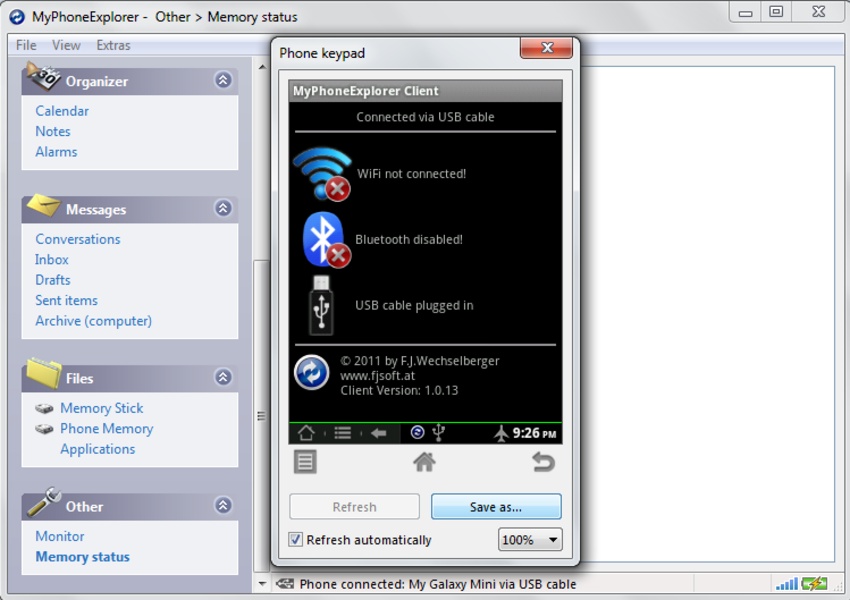 Если вы являетесь владельцем мобильного телефона Sony Ericsson, и вы хотите настроить его, теперь вы можете забыть о тех платных услугах, которые вы видите по телевизору, потому что благодаря MyPhoneExplorer вы сможете сделать это бесплатно.Кроме того, вы сможете управлять своими контактами, синхронизировать с Outlook, Sunbird или Thunderbird, или управлять своими входящими SMS.Кабель, Bluetooth или ИК-порт - вы решаете тип вашего соединения. Как только мобильный телефон подключен, вы сможете настроить и управлять им.Он очень простой в использовании, даже если вы используете мобильный менеджер впервые , благодаря интуитивно понятному интерфейсу.Адресная книга, файловый менеджер, рингтоны, музыка, фотографии... Короче, весь мобильный контент теперь управляется с компьютера.