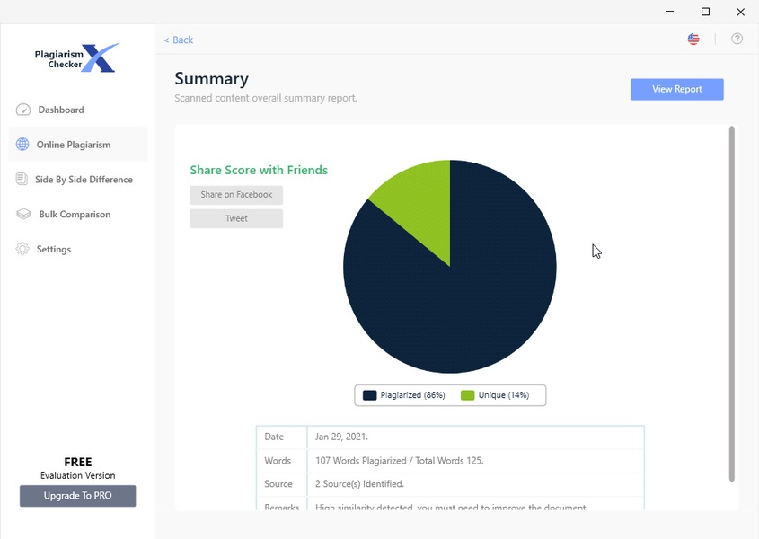 Plagiarism Checker X - это программа, которая поможет вам всего за несколько секунд проверить, не был ли какой-либо отрывок или документ плагиатом. Все, что вам нужно сделать, это выбрать файл, который вы хотите проанализировать, и дождаться, пока программа сравнит его со своей базой данных. Для этой части процесса вам потребуется подключение к Интернету.Программу можно использовать одним из двух способов, в зависимости от того, студент вы или учитель: ученики могут проверить свою работу, чтобы убедиться, что она не слишком похожа на источники, которые они использовали, и учителя могут ее использовать для проверки на наличие плагиата.Публикация уникального контента важна для высокого ранга в результатах поиска, что является еще одним отличным способом воспользоваться этой программой. Благодаря Plagiarism Checker X вы можете убедиться, что все, что вы собираетесь публиковать, действительно уникально, максимизируя влияние SEO и избегая неприятных сюрпризов.Эта базовая (и бесплатная) версия позволяет проверять только первые 130 слов любого документа, отрывка или веб-сайта. Тем не менее, это отличный способ понять, как работает программа.Plagiarism Checker X - отличный инструмент для учителей, студентов и всех, кто регулярно публикует контент в Интернете. С его помощью вы можете убедиться, что ваш контент на 100% уникален, и все это за считанные секунды.